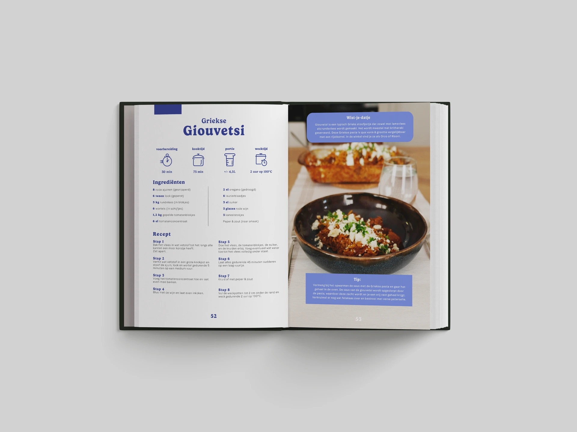 Voor dit project was ik verantwoordelijk voor zowel de vormgeving van het boek als de fotografie. Ik ontwierp de volledige lay-out en zorgde ervoor dat de recepten op een heldere en aantrekkelijke manier gepresenteerd werden. Daarnaast verzorgde ik ook de foodfotografie, waarbij de focus lag op natuurlijke belichting en beelden die de gerechten op een warme en authentieke manier tonen.